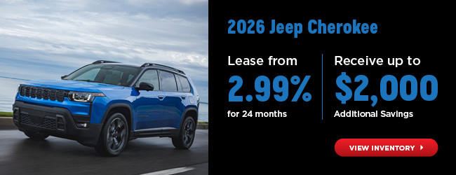 *Limited time lease offer provided through SCI Lease Corp on all new and previously unregistered 2026 Jeep Cherokee Overland models, on approved credit. Example: 2026 Jeep Cherokee Overland with a retail value of $57,020, leased at 2.99% for 24 months with $0 down payment, equals 24 monthly payments of $1,032. $0 down payment, $1,032 security deposit and first monthly payment due at lease inception. Total obligation is $24,782. Kilometre allowance of 16,000/year. Cost of $0.16 per excess kilometre plus applicable taxes at lease termination. The Lease price represents the Manufacturer's Suggested Retail Price ("MSRP"), freight, federal A/C surcharge, applicable green levies, Luxury Tax surcharges (if applicable), Lien registration fee (up to $130, including registering agent fee, where applicable), and all other fees, levies, and duties (all of which may vary by region and retailer), minus current Manufacturer Discounts (and any applicable dealer contributions), which allow the dealer to sell for less. License, registration, insurance, specific duty on new tires (up to $15, in Quebec only), and applicable taxes are extra and will be due at signing. Offer may be modified or terminated without notice. A deposit may be required. Dealer trade may be necessary (where applicable), but may not be available in all cases. †Voucher must be presented at the time of vehicle purchase. ‡Based on manufacturer’s estimates. Your actual fuel consumption will vary based on driving habits and other factors. Use for comparison purposes only. Ask your retailer for EnerGuide information. When properly equipped. Specific model and optional equipment are required to achieve the maximum ratings shown. Offers valid April 16, 2026 only. Some conditions and restrictions may apply. Offers subject to change or cancellation without notice. Contact Jim Pattison Chrysler Jeep Dodge Surrey for complete details.